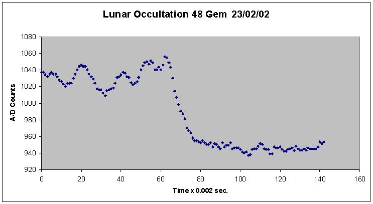 Date: 23/02/02 Time: 20:24:19 U.T.C. disappearance of the star: 48 Gem F5 Mag.= 5.8